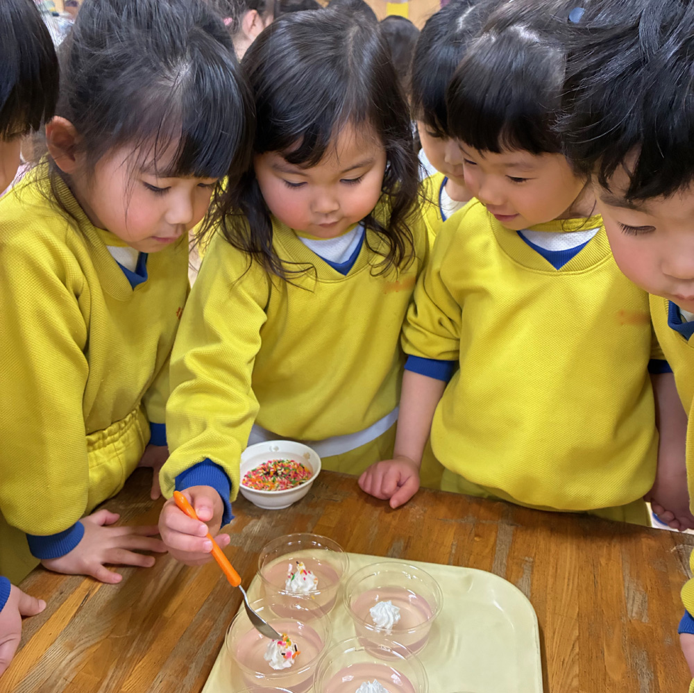 お昼ごはんのデザートとして、自分たちで作ったゼリーに生クリームとチョコスプレーをトッピングし、嬉しそうに味わう姿も見られましたよ🎵