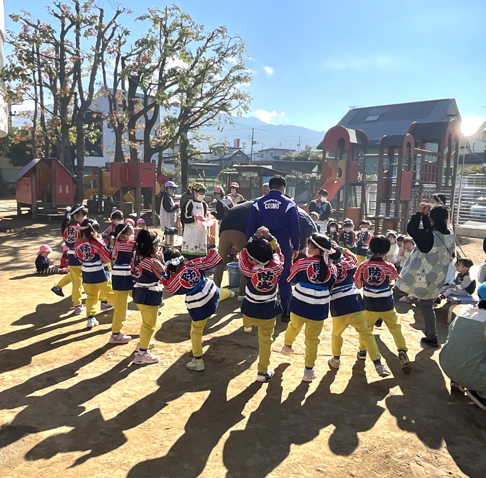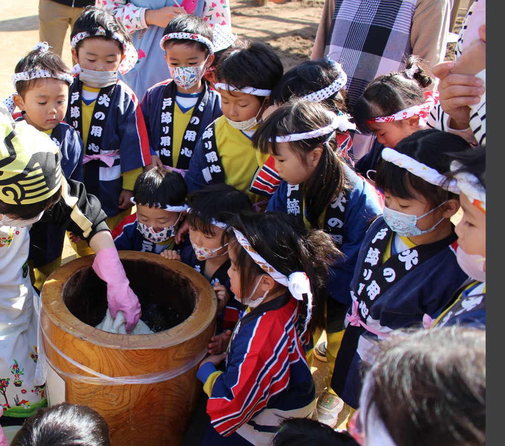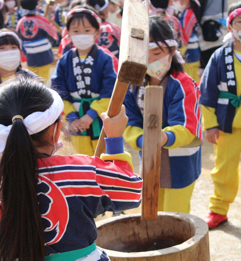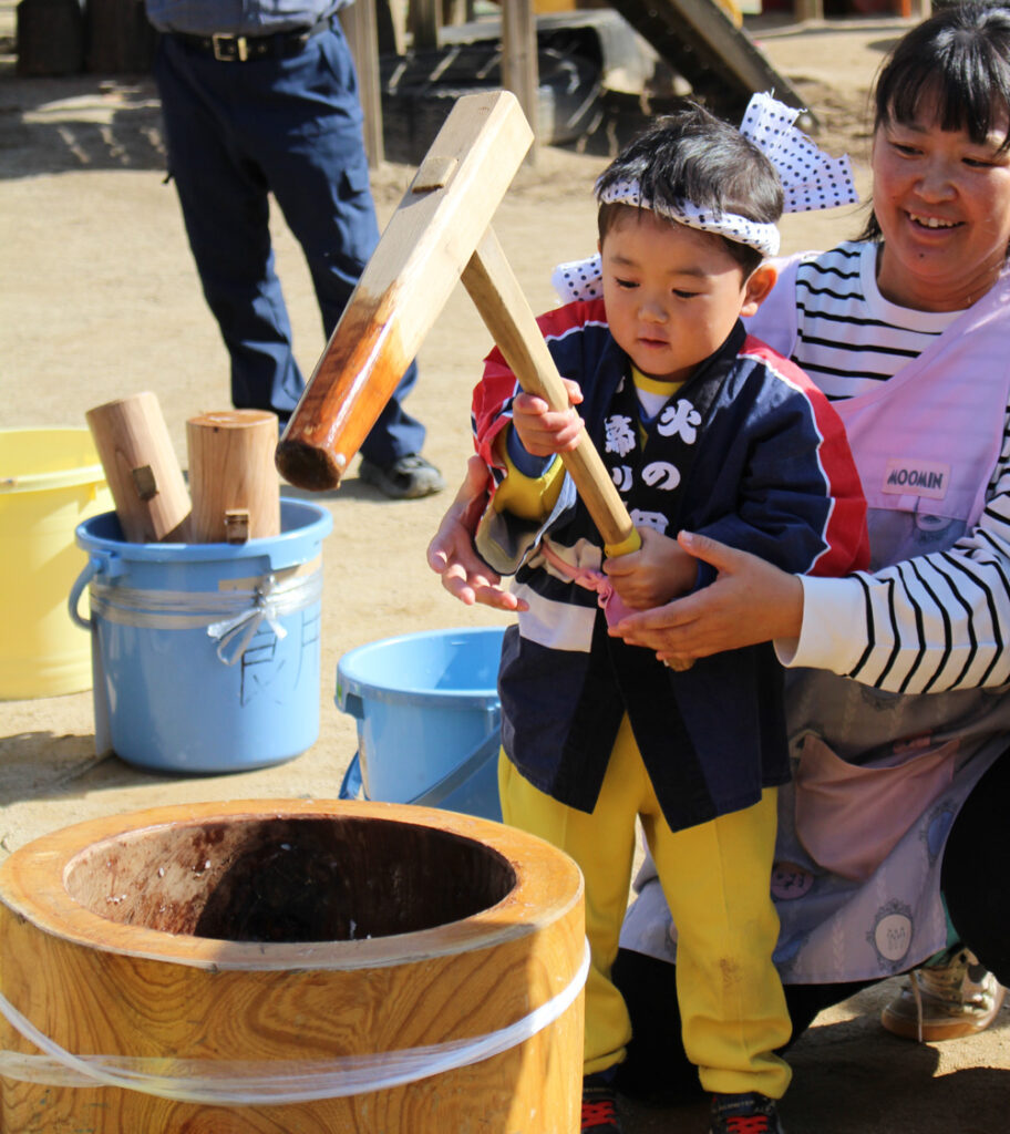 「よいしょー!よいしょー!」と大きな声で応援しながら、元気いっぱいおもちをつくことができました!