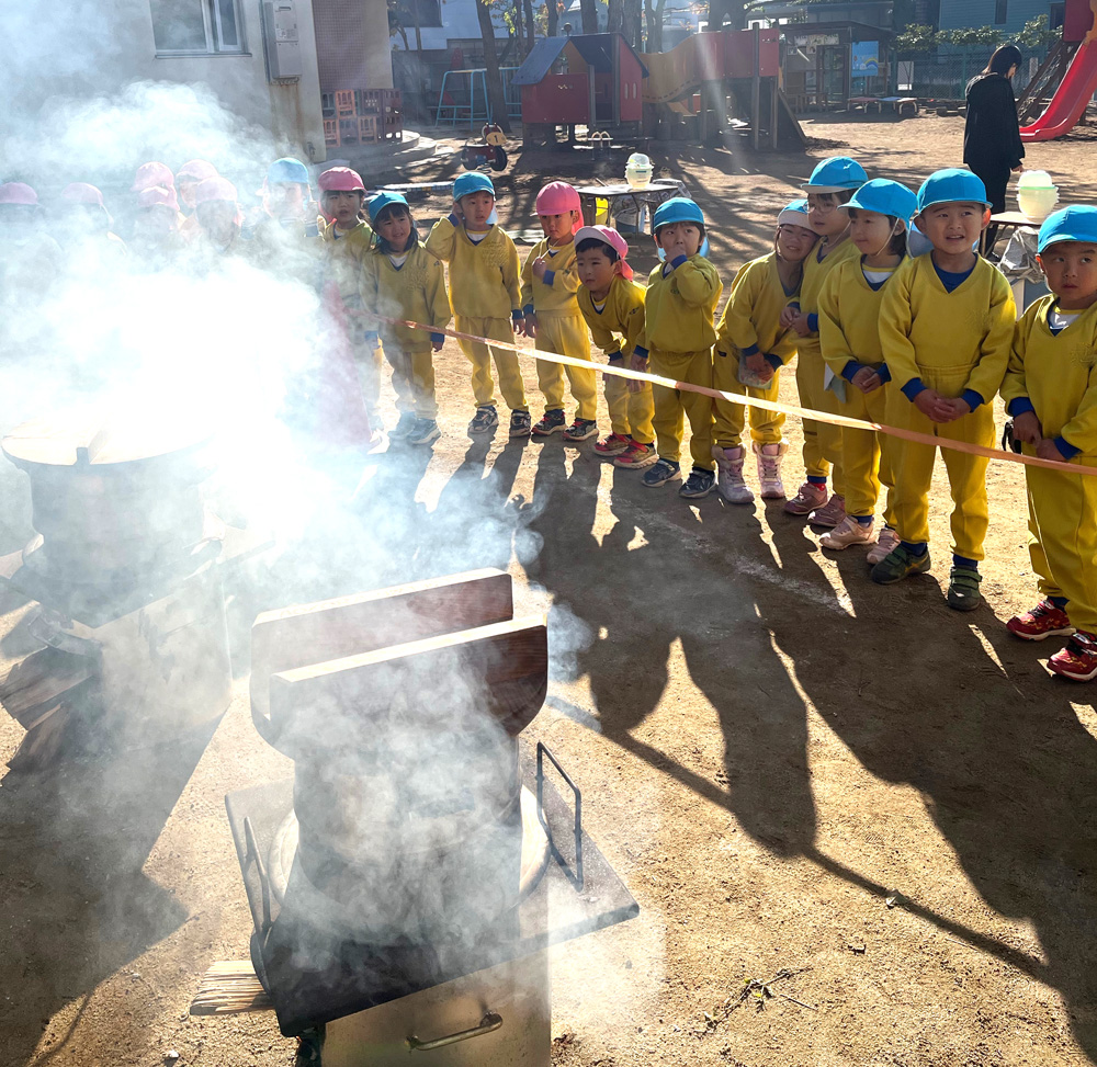 朝登園すると、かまどで薪を燃やしている様子をみて「煙がいっぱい出てる!」と興味津々の子どもたち。