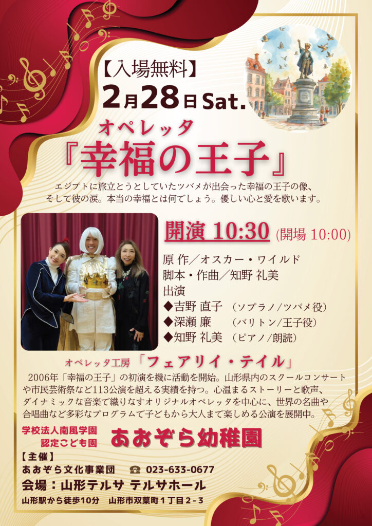 2月28日(土)には、山形テルサホールを会場に、音楽に親しむ会コンサート〈オペレッタ『幸福の王子』〉を開催しました🎵